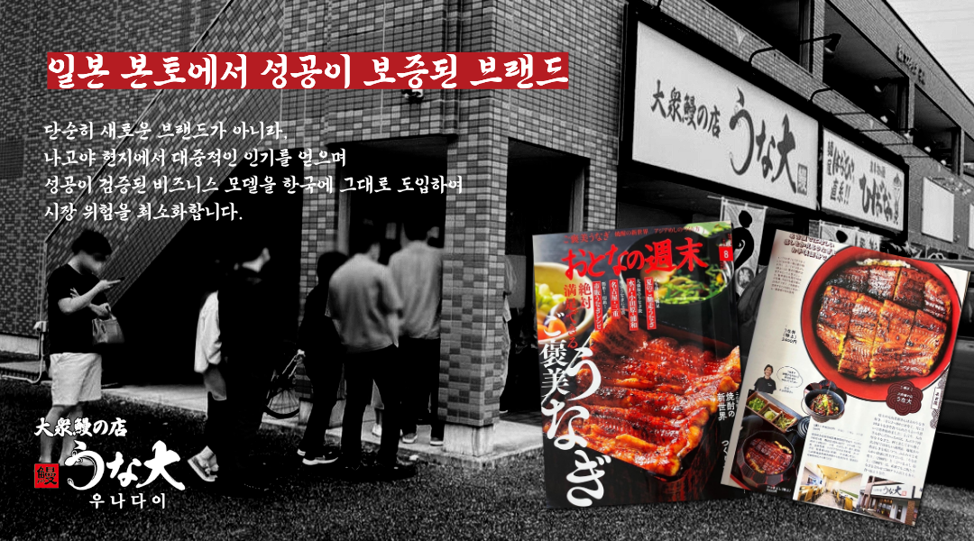 저희 우나다이는 단순한 식당을 넘어 히츠마부시(장어덮밥)의 발상지인 일본 나고야의 미식 철학을 담아 정통의 맛과 방식을 전문적으로 구현하는 프리미엄 미식 브랜드입니다. 저희는 최상급 장어 요리 경험을 선사하는 것을 최우선 목표로 하며, 격조 높은 미식 가치를 대중적인 가격대로 편안하게 즐기실 수 있도록 혁신을 거듭하고 있습니다.